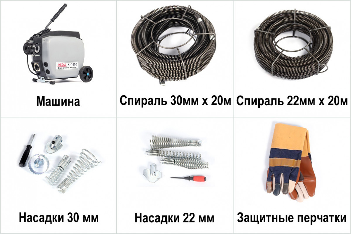Машина может работать со спиралями диаметром 22 или 30 мм, максимальная длина прочистки 80 метров. Поставляется со спиралями 22 и 30 мм, а также наборами насадок для устранения различных засоров.